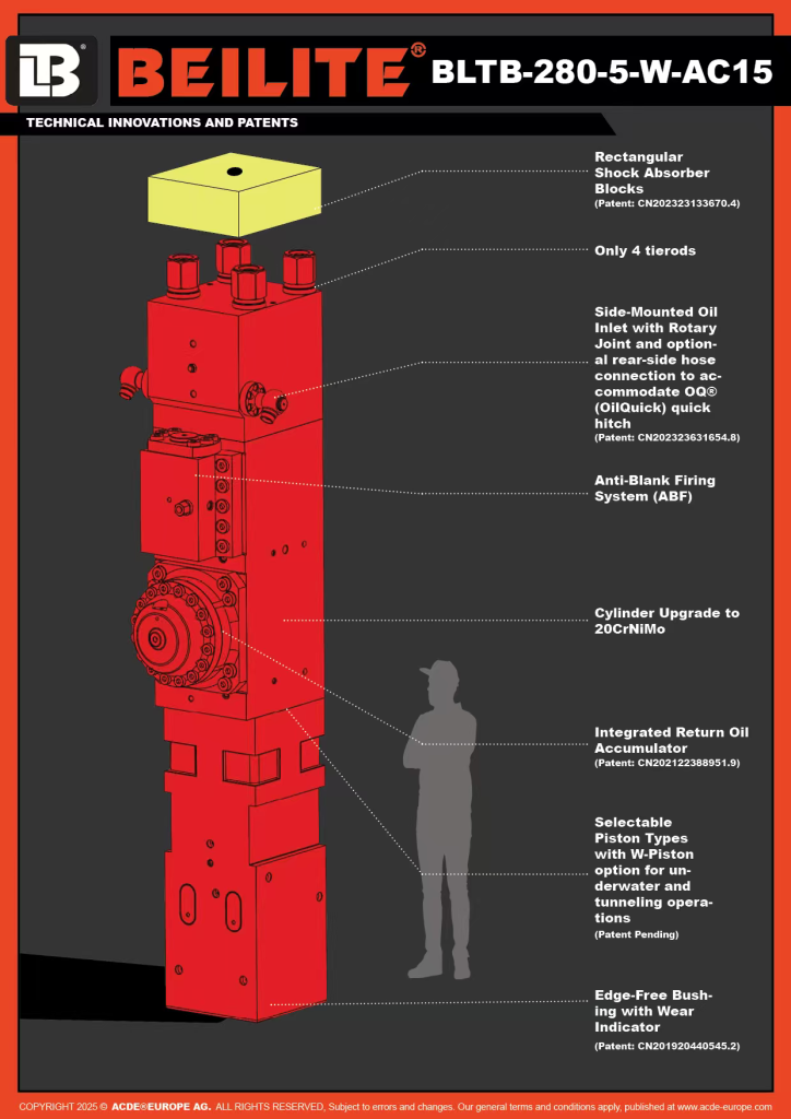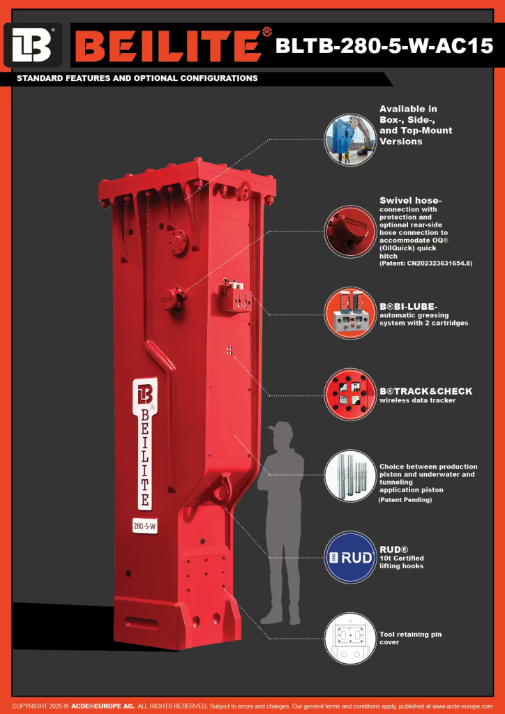 The BEILITE® Europe BLTB-280-5-W-AC15 represents a major leap in hydraulic breaker engineering. Designed for 100–350-ton excavators, it meets the surging global demand for high-output, non-explosive heavy-duty demolition and rock fragmentation in large-scale mining, tunneling, and infrastructure projects.